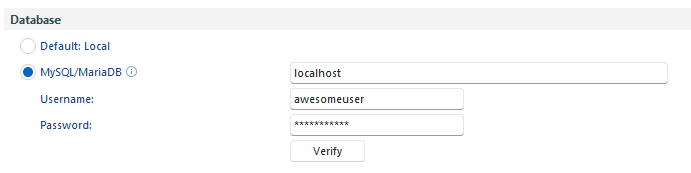 The SQL server is configured in the Awesome Miner Options dialog, History section. Select MySQL/MariaDB and specify the hostname of the SQL server together with the username and password created in the previous step.